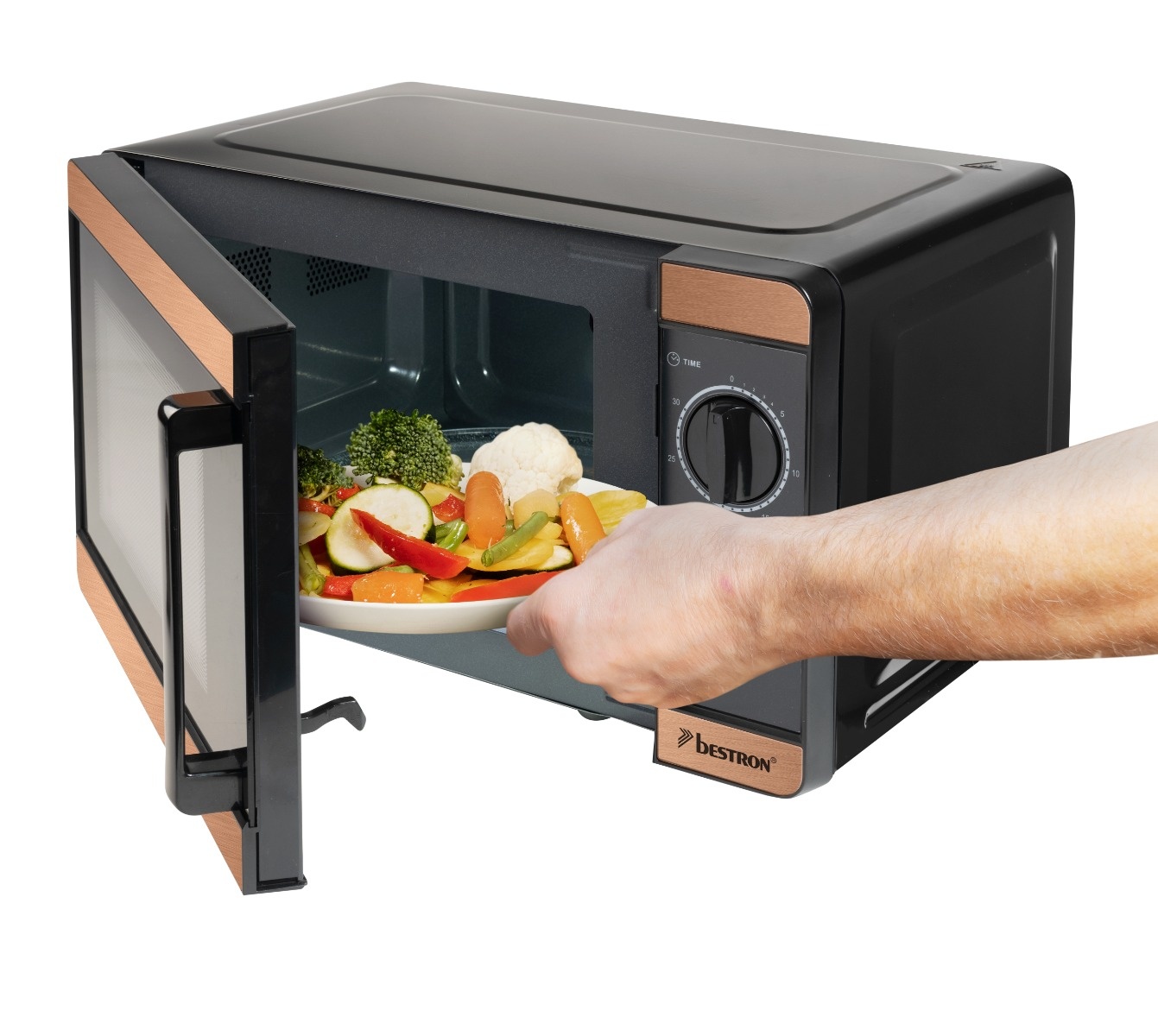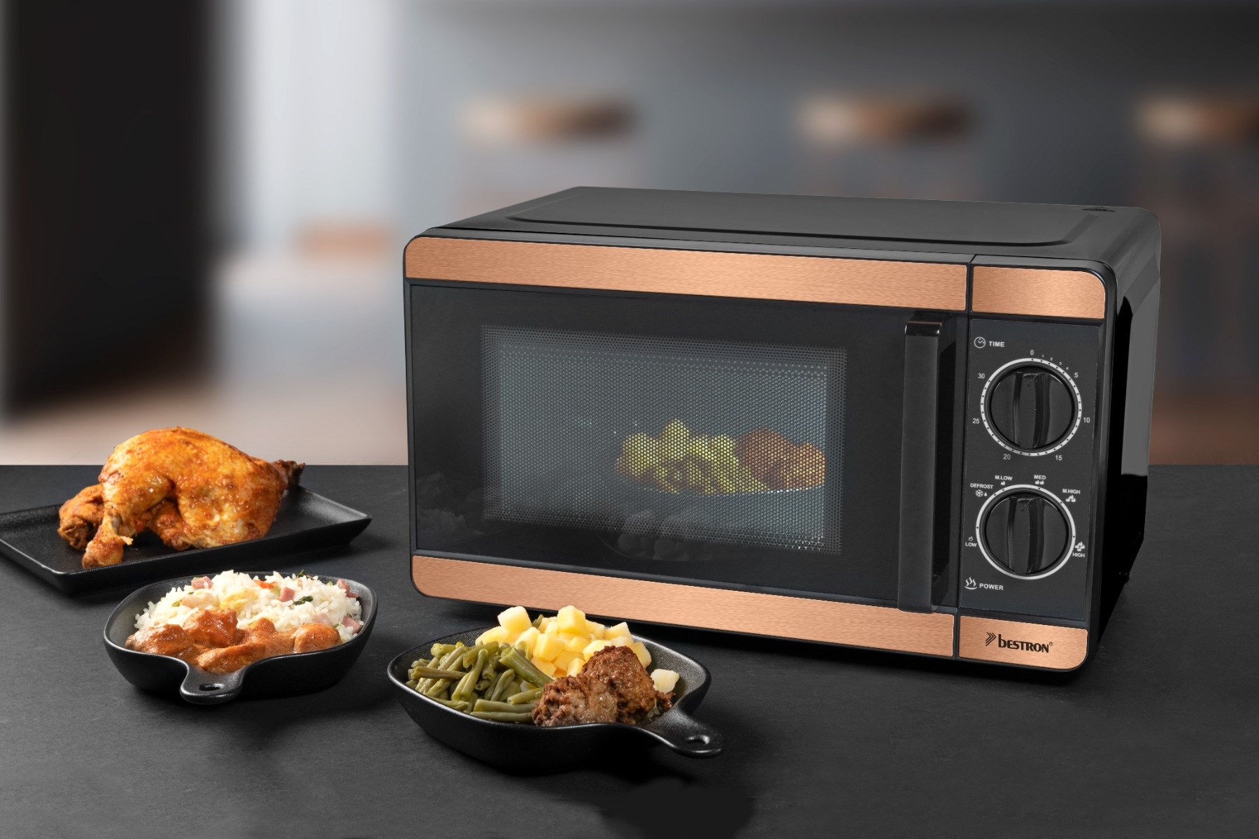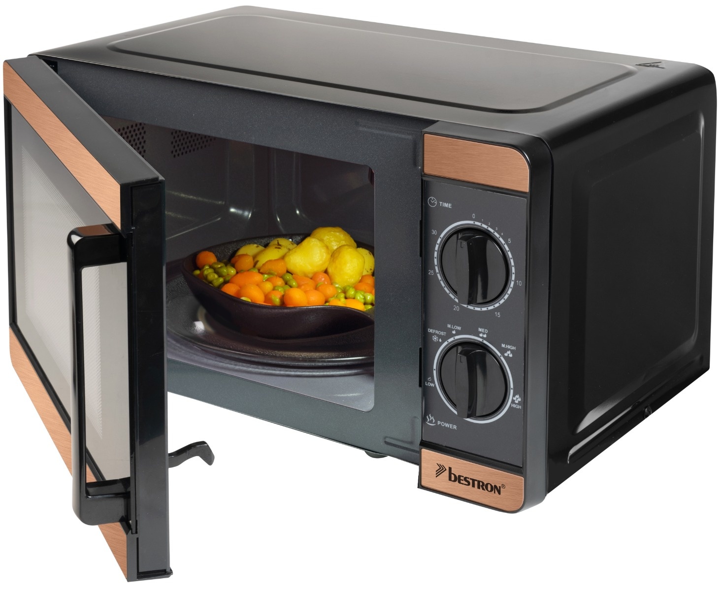 • Kompakter mechanischer Mikrowellenherd 20L • 20 Liter Ofenraum • 30-Minuten-Timer mit Endsignal • 6 voreingestellte Programme – inklusive Auftauen • Glasdrehteller ø 245 mm • Auftau-Einstellung • Signal zum Ende des Garvorgangs • Tür aus Glas und schwarzem Kunststoff, mit schwarzem Griff • Innenbeleuchntung • Edelstahlakzent in Kupferoptik auf der Vorderseite • Schwarze Knöpfe