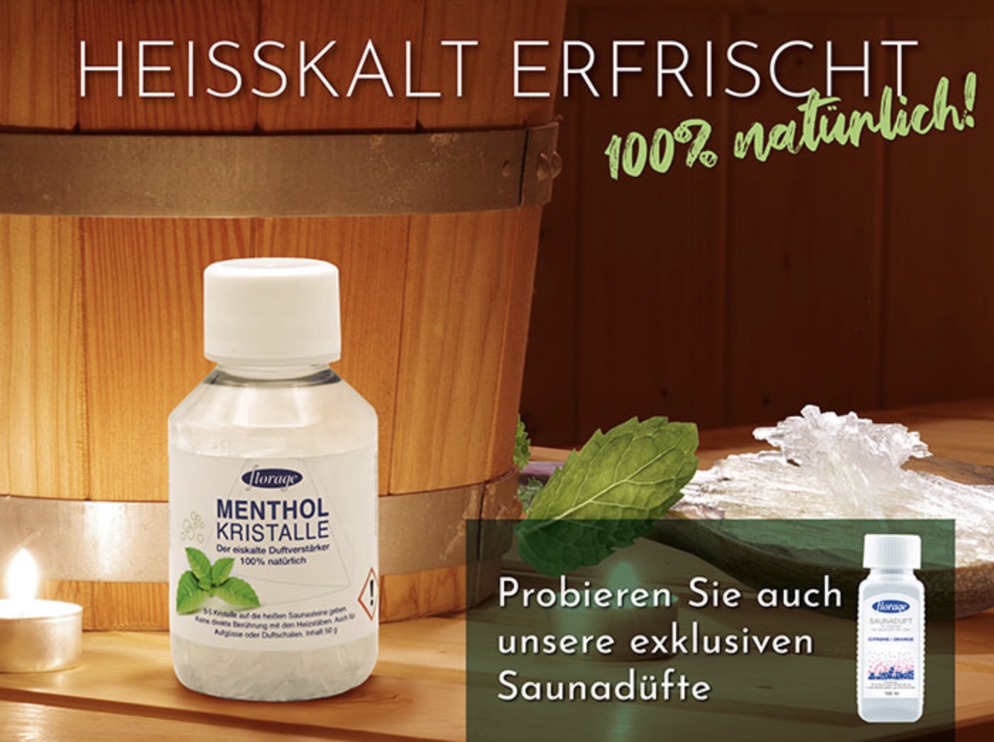 Die Verwendung von Mentholkristallen in der Sauna kann einen Saunaaufguss intensivieren oder für einen zusätzlichen Frische- und Kühleffekt sorgen. Mentholkristalle variieren in der Farbe von transparent bis weiß. Die Kristalle sind bei Zimmertemperatur fest, schmelzen aber bei 42-43°C.