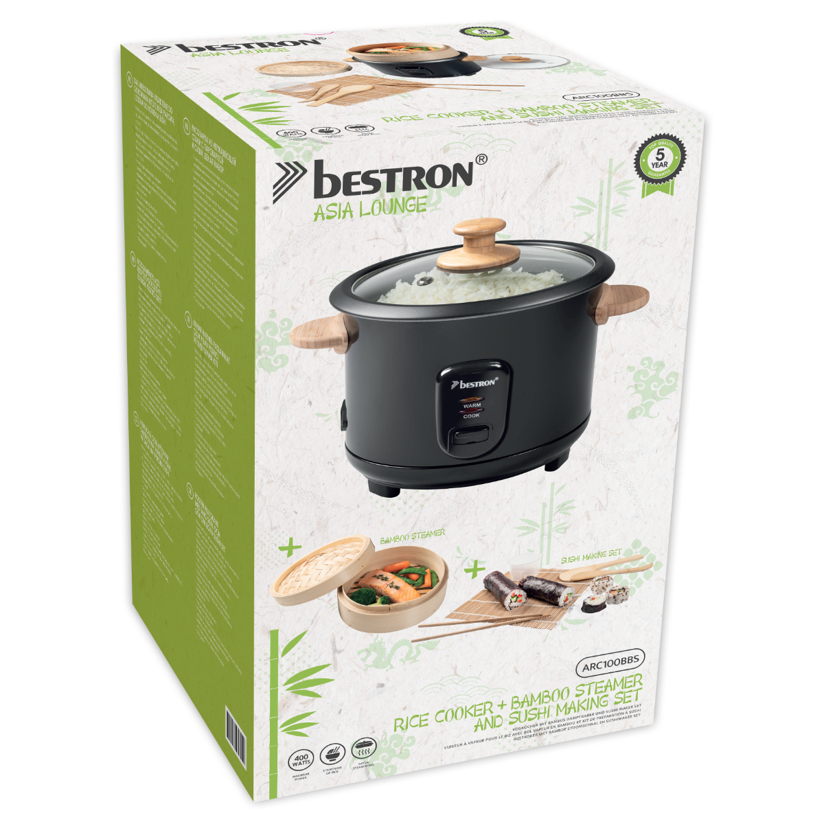 • Inkl. 5-teiliges Sushi-Maker-Set bestehend aus: 2x Stäbchen, Bambus-Rolle, 1x kleiner Löffel, 1x Großer Löffel, 1x Messbecher)