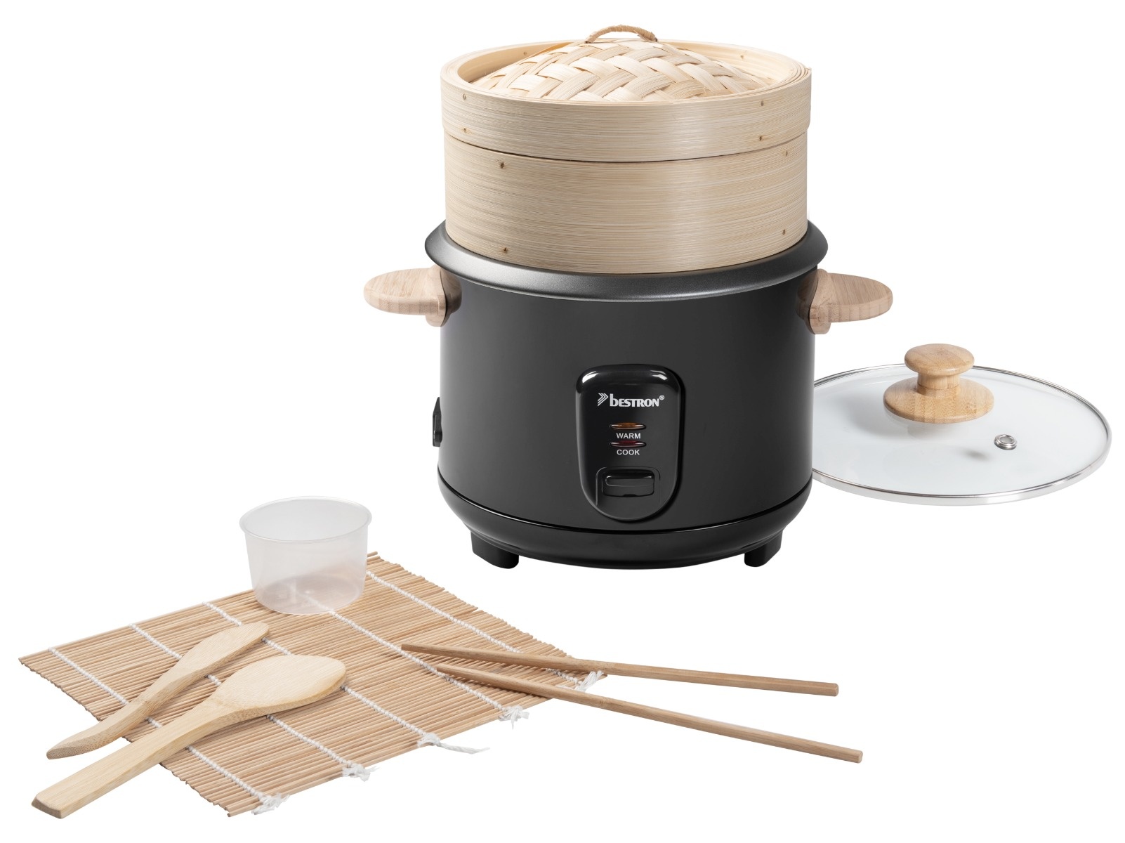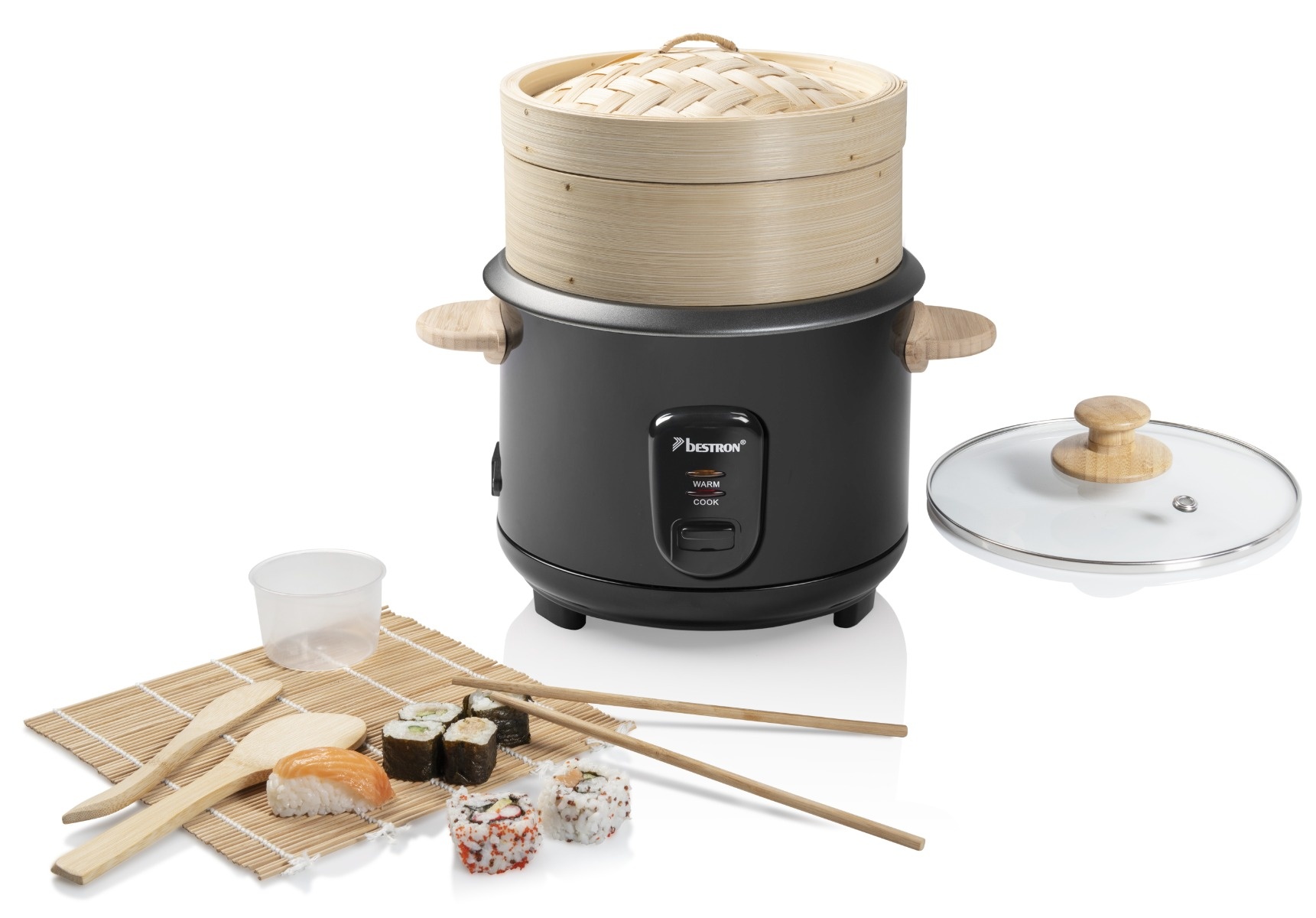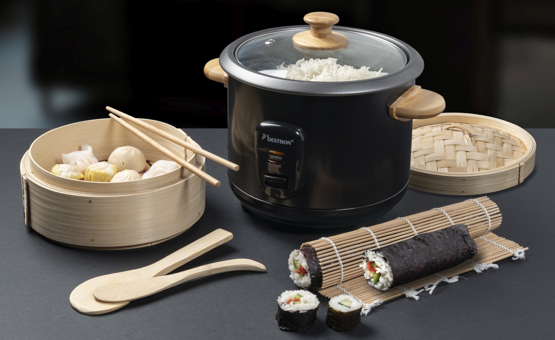 EDELSTAHL REISKOCHER MIT BAMBUS DAMPFKORB|UND SUSHI MAKER SET