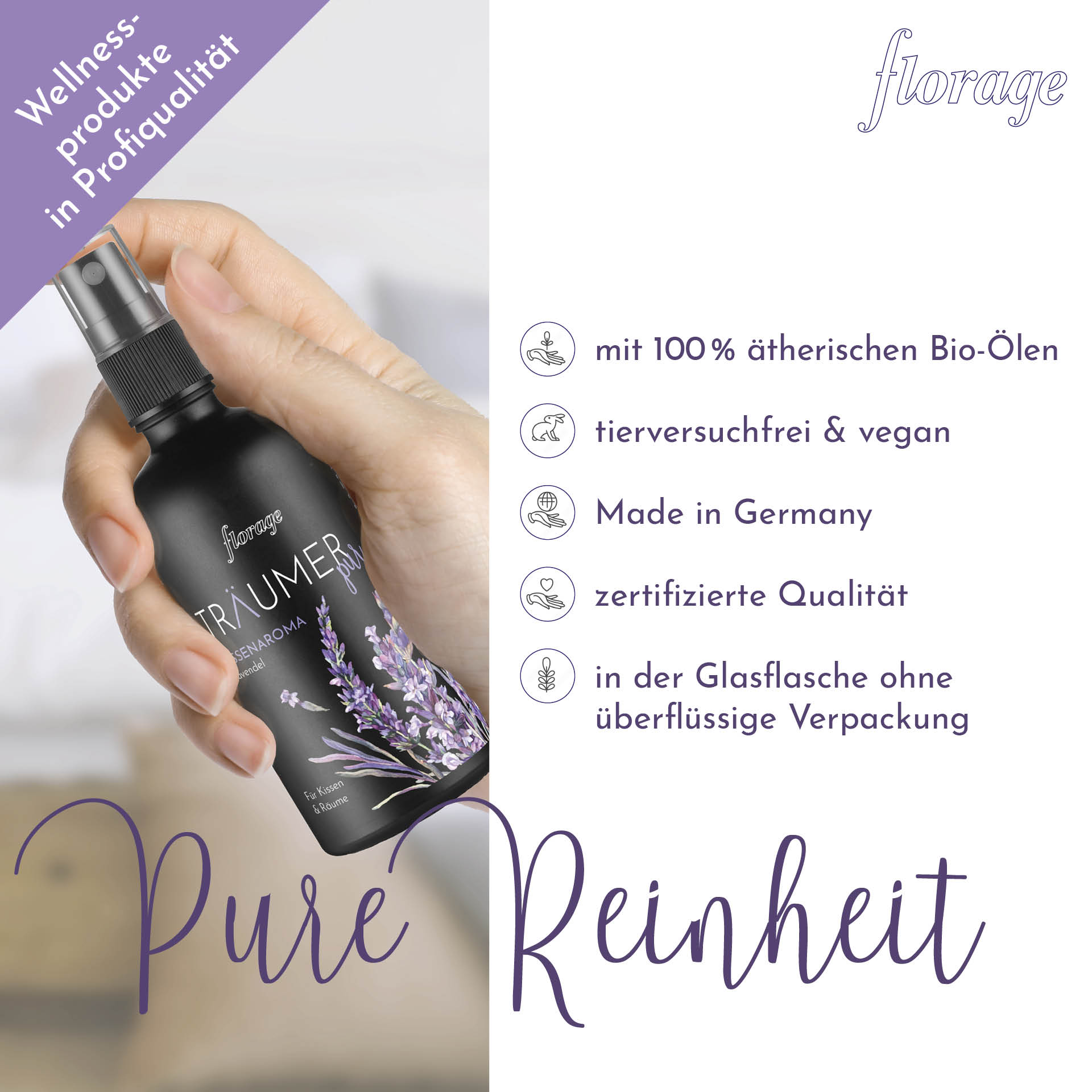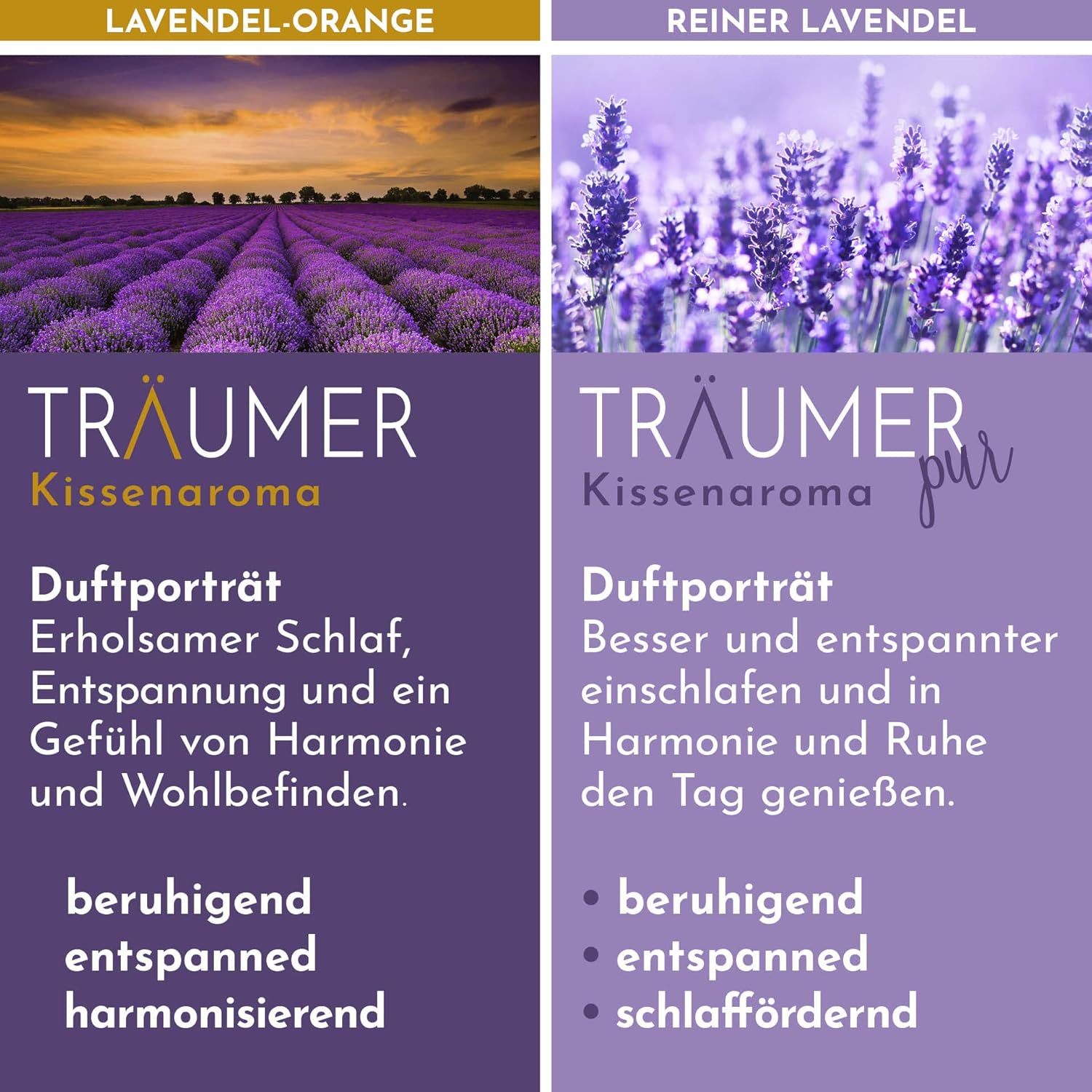 Duftporträt: Mit natürlichem ätherischen Bio-Lavendelöl. Besser und entspannter einschlafen und in Harmonie und Ruhe den Tag geniessen. Beruhigend, entspannend, schlaffördernd.