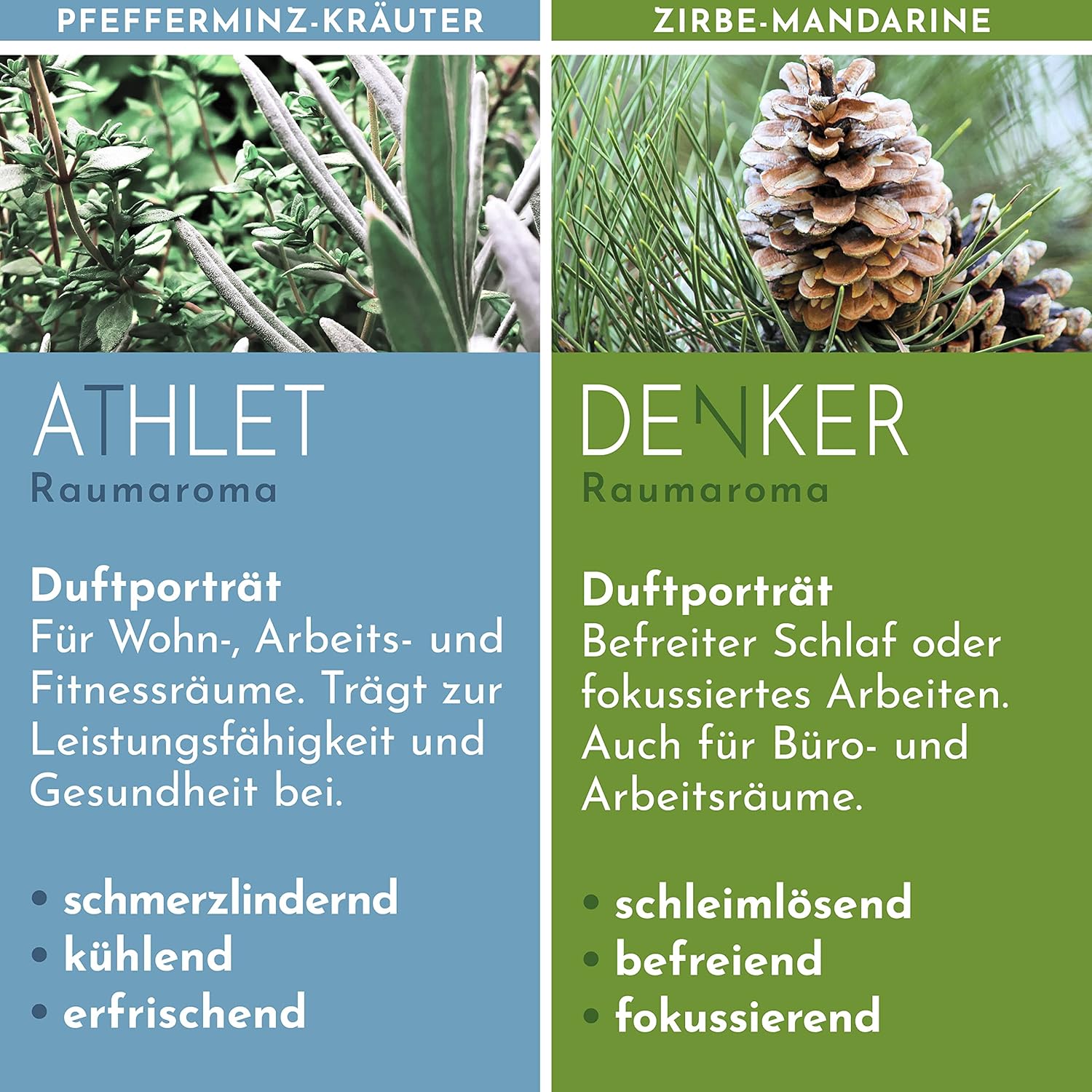 Duftporträt: Ein belebender Duft mit natürlichem Bio-Zirbenöl der den Geist anregt. Befreiter Schlaf oder fokussiertes Arbeiten. Auch für Büro- und Arbeitsräume. Schleimlösend, befreiend, fokussierend.