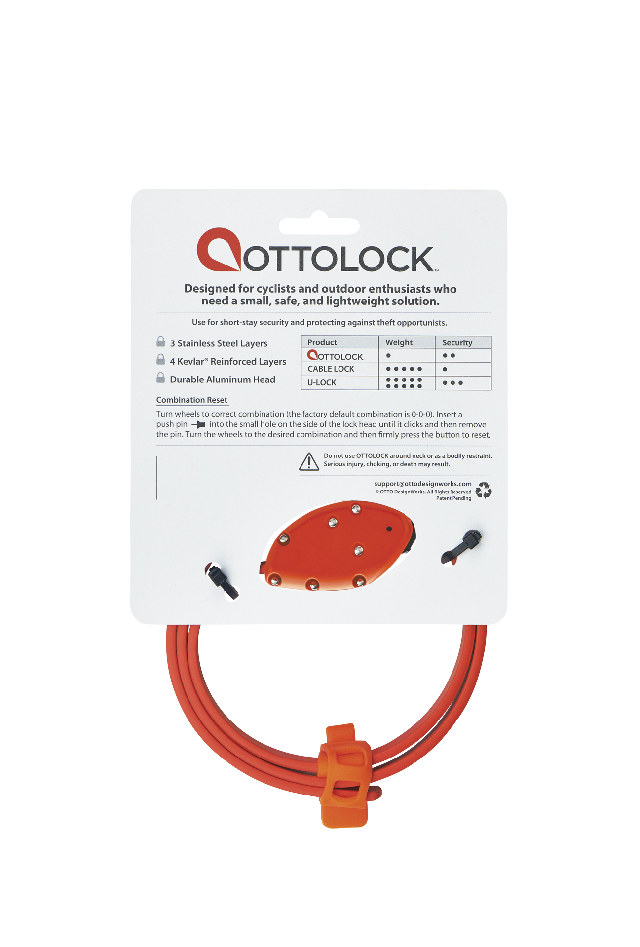 Das Ottolock Chinch Lock eignet sich als Diebstahlschutz für kurze Stopps. Es ist sicherer als ein Kabelschloss und ist mit einem Startgewicht von nur 120 g deutlich leichter als ein U-Lock und lässt sich bequem in der Satteltasche o. ä. verstauen. Mehrschichtige Stahl- und Kevlar-Bänder (18 mm breit) machen es sehr schnittfest und stärker als Kabelschlösser.